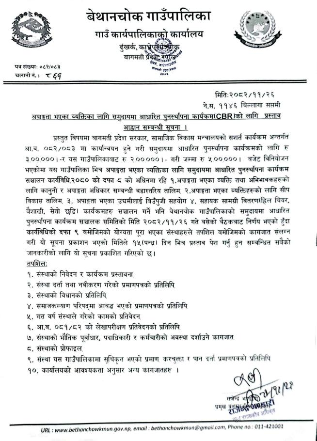 » अपाङ्गता भएका व्यक्तिका लागि समुदायमा आधारित पुनर्स्थापना कार्यक्रमको लागि प्रस्ताव आह्वान सम्बन्धी सूचना ।।