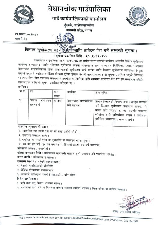 किसान सूचीकरण सहजकर्ताको लागि आवेदन पेश गर्ने सम्बन्धी सूचना ।।।
