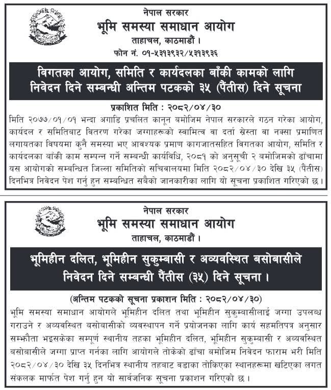 भूमिहीन दलित , भूमिहीन सुकुम्बासी र अव्यवस्थित बसोबासी ले निवेदन दिने सम्बन्धि ३५ दिने सूचना ।।