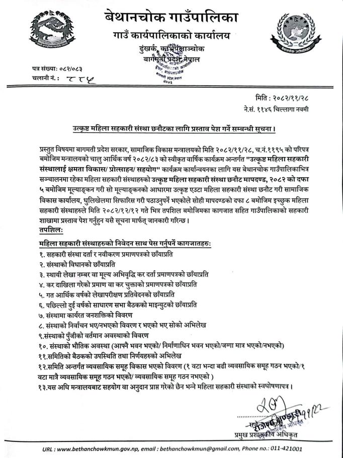 » उत्कृष्ट महिला सहकारी संस्था छनोटका लागि प्रस्ताव पेश गर्ने सम्बन्धी सूचना ।।