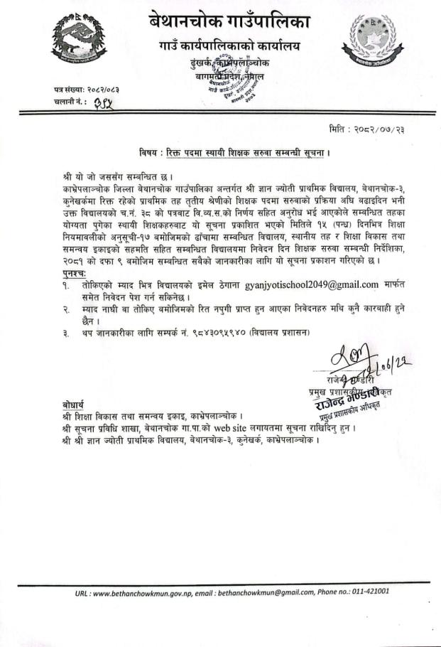 रिक्त पदमा स्थायी शिक्षक सरुवा सम्बन्धमा ।